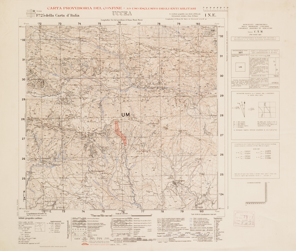 "...AD USO ESCLUSIVO DEGLI ENTI MILITARI. Rappresentazione orografica a curve di livello l'equidistanza è di metri 25, per le curve a tratti è di metri 5. In basso vi sono i segni convenzionali. La rappresentazione del confine, situazione del 1952."