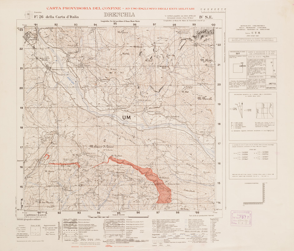 "...AD USO ESCLUSIVO DEGLI ENTI MILITARI. Rappresentazione orografica a curve di livello l'equidistanza è di metri 25, per le curve a tratti è di metri 5. In basso vi sono i segni convenzionali. La rappresentazione del confine, situazione del 1952."