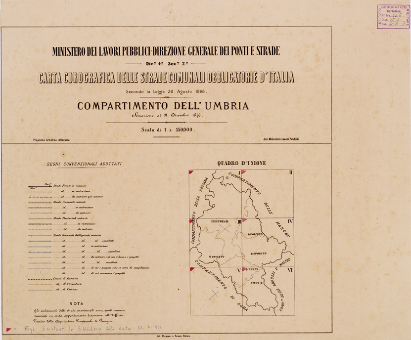 "...SITUAZIONE AL 31 DICEMBRE 1876. Rappresentazione orografica planimetrica. Accanto al quadro d'unione vi sono i segni convenzionali adottati. Ministero dei Lavori Pubblici Direzione Generale dei Ponti e Strade. Litografia Virano e Teano, Roma."