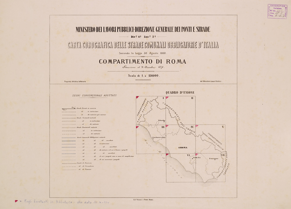 "...SITUAZIONE AL 31 DICEMBRE 1876. Rappresentazione orografica planimetrica. Accanto al quadro d'unione vi sono i segni convenzionali adottati. Ministero dei Lavori Pubblici Direzione Generale dei Ponti e Strade. Litografia Virano e Teano, Roma."