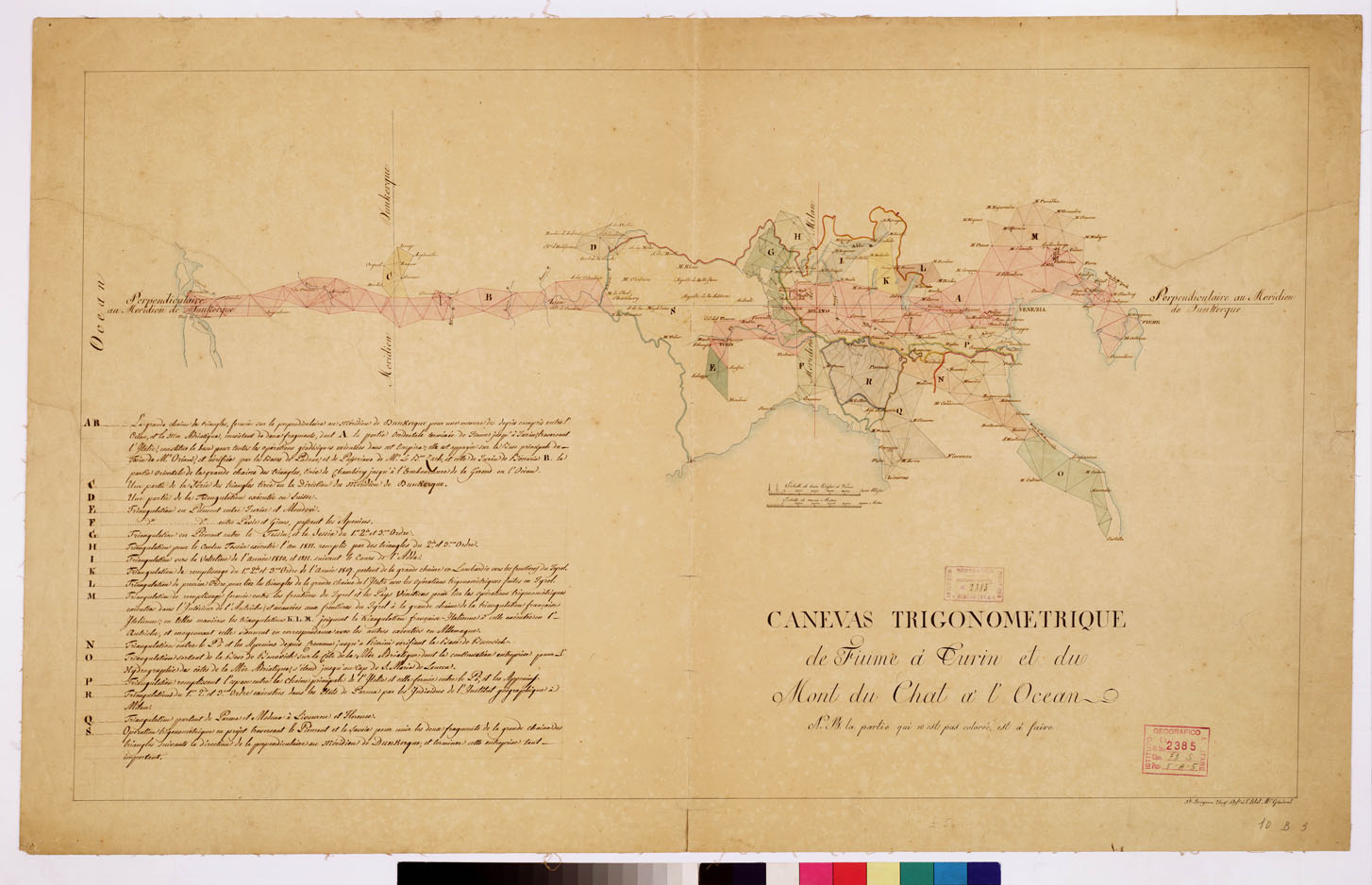 "Rappresentazione orografica planimetrica. Nella parte sinistra della carta sono presenti le varie triangolazioni. Sopra il titolo vi sono due scale grafiche rispettivamente in Klafter di Vienna e in metri. J. Brignon Ing. de l'Etat M.r Général."