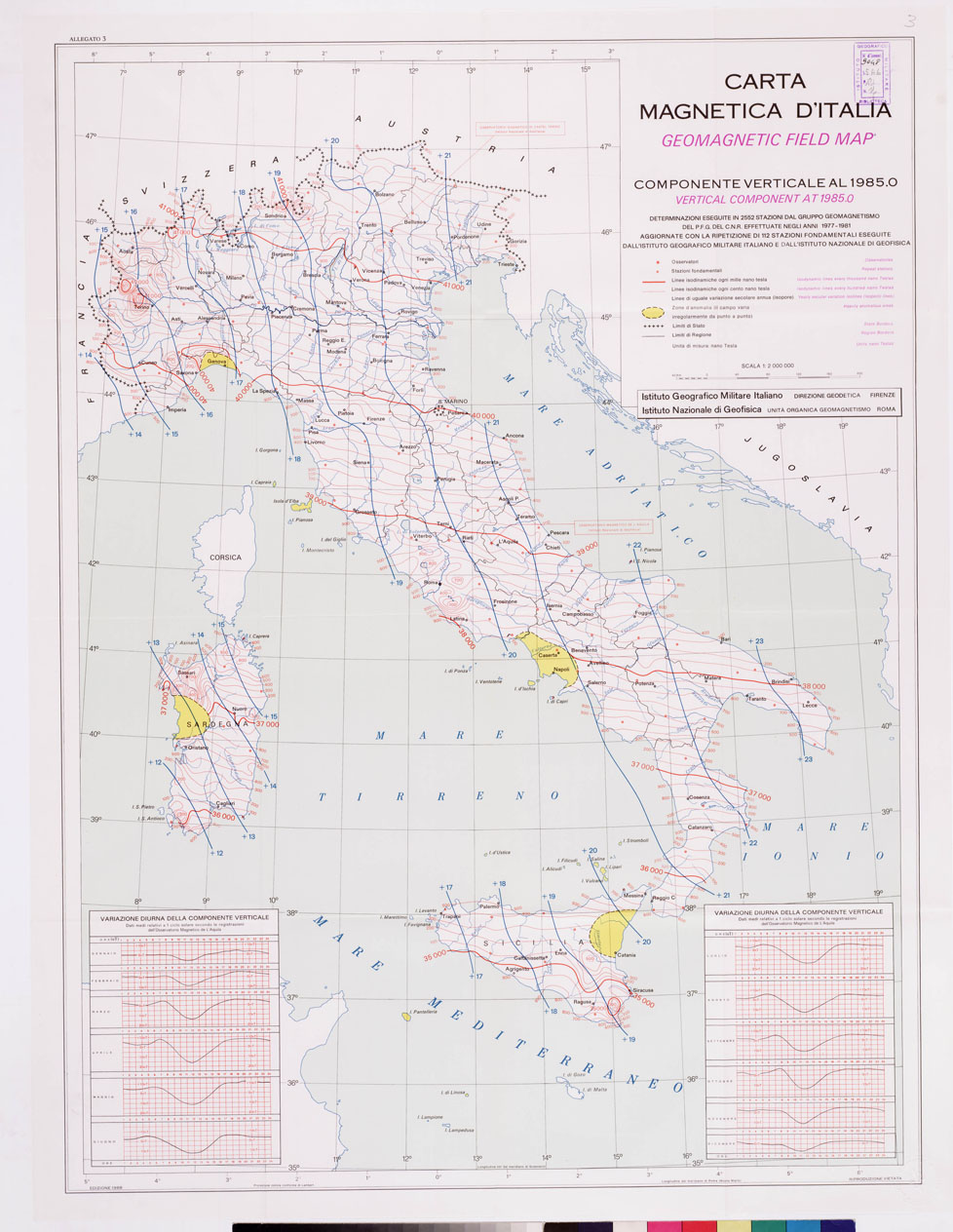 "...COMPONENTE VERTICALE AL 1985.0. Determinazioni eseguite in 2552 stazioni dal gruppo geomagnetismo del P.F.G. del C.N.R. effettuate negli anni 1977-1981 aggiornate con la ripetizione di 112 stazioni fondamentali eseguite dall'I.G.M. Italiano e dall'Istituto Nazionale di Geofisica. Sotto al titolo è presente la spiegazione dei segni. In basso vi sono le variazioni diurne della componente verticale."