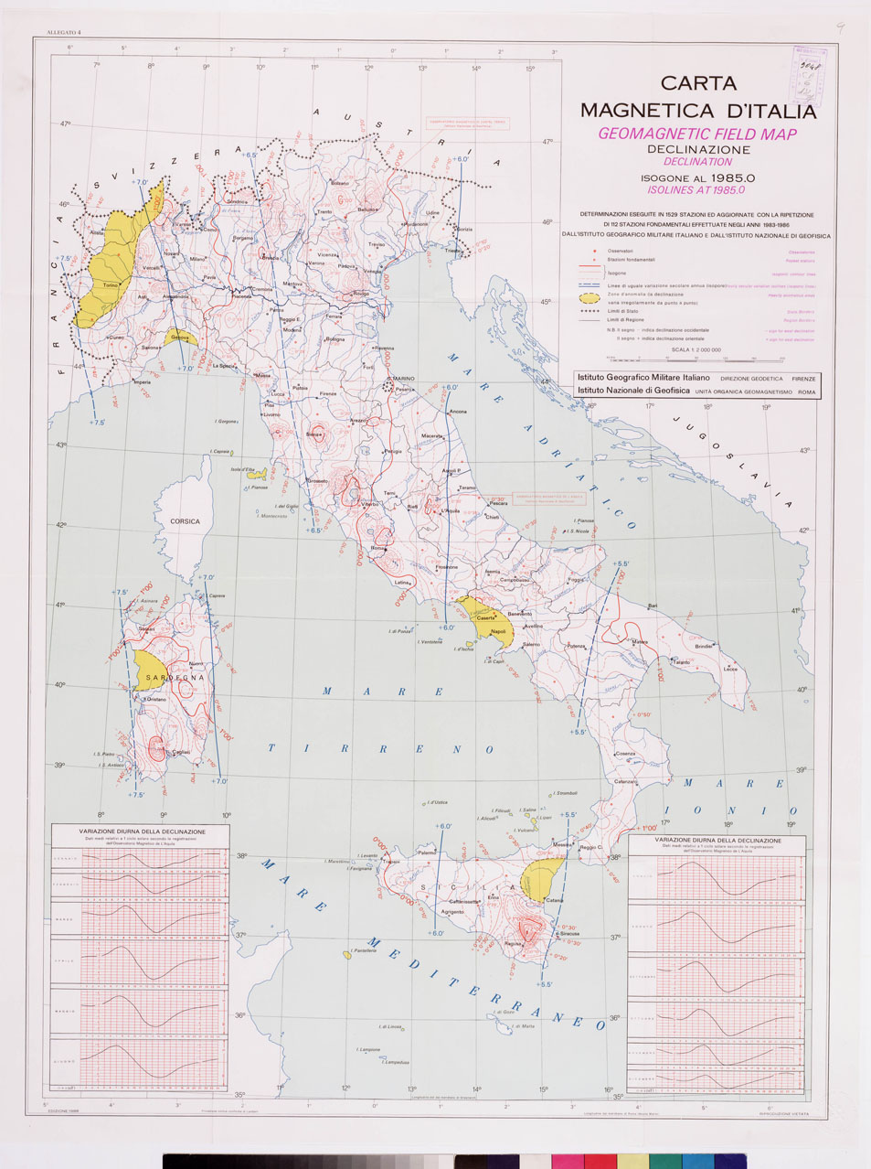 "...DECLINAZIONE ISOGONE AL 1985.0. Determinazioni eseguite in 1529 stazioni ed aggiornate con la ripetizione di 112 stazioni fondamentali effettuate negli anni 1983-1986 dall'I.G.M. Italiano e dall'Istituto Nazionale di Geofisica. Sotto al titolo è presente la spiegazione dei segni. In basso vi sono le variazioni diurne della declinazione."