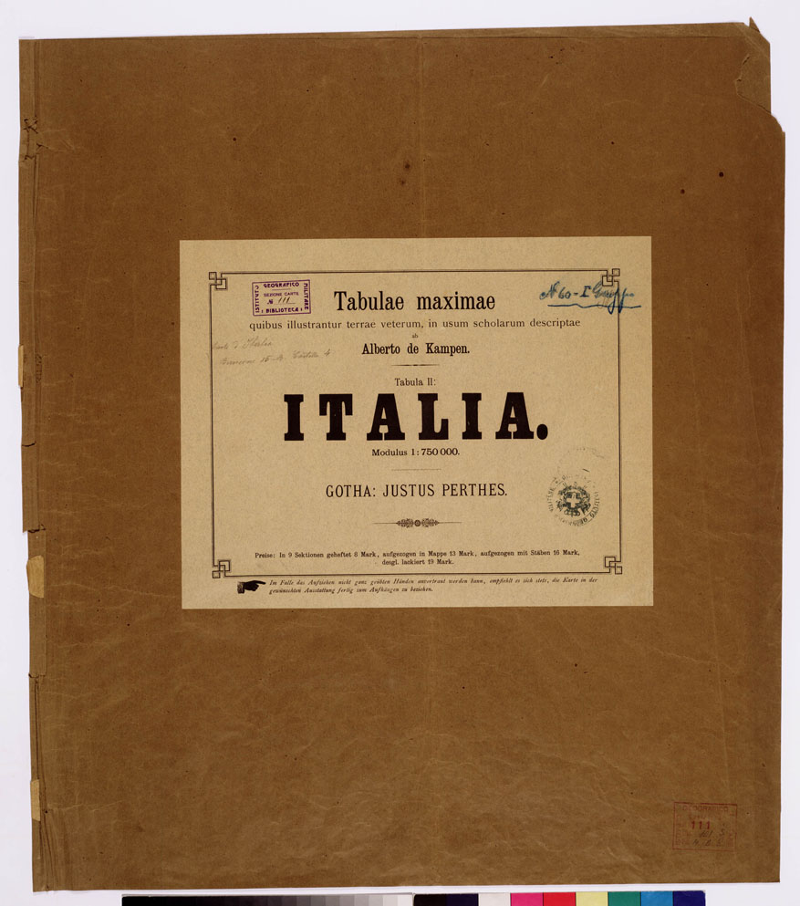"...QUIBUS ILLUSTRANTUR TERRAE VETERUM, IN USUM SCHOLARUM DESCRIPTAE AB ALBERTO DE KAMPEN. GOTHA: JUSTUS PERTHES. Rappresentazione orografica a tratteggio. Grafia in latino. Gotha: Justus Perthes. Nel foglio n. 3 è presente il titolo nel foglio n. 7 una carta dell'Italia divisa in 11 regioni."