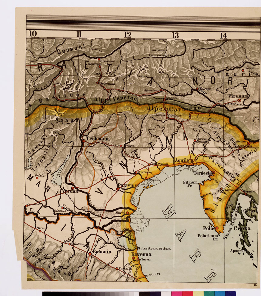 "...QUIBUS ILLUSTRANTUR TERRAE VETERUM, IN USUM SCHOLARUM DESCRIPTAE AB ALBERTO DE KAMPEN. GOTHA: JUSTUS PERTHES. Rappresentazione orografica a tratteggio. Grafia in latino. Gotha: Justus Perthes. Nel foglio n. 3 è presente il titolo nel foglio n. 7 una carta dell'Italia divisa in 11 regioni."