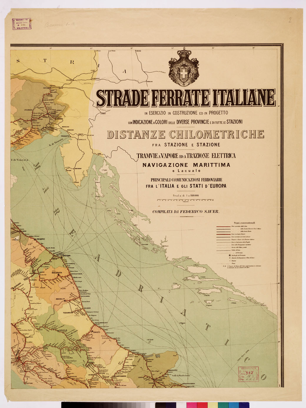 "...IN ESERCIZIO IN COSTRUZIONE ED IN PROGETTO CON INDICAZIONE A COLORI DELLE DIVERSE PROVINCIE E DI TUTTE LE STAZIONI DISTANZE CHILOMETRICHE FRA STAZIONE E STAZIONE TRAMVIE A VAPORE ED A TRAZIONE ELETTRICA NAVIGAZIONE MARITTIMA E LACUALE PRINCIPALI COMUNICAZIONI FERROVIARIE FRA L'ITALIA E GLI STATI D'EUROPA. COMPILATA DA FEDERICO SAUER. Rappresentazione orografica planimetrica. Nel foglio n. 2 sono presenti il titolo ed i segni convenzionali. Nel foglio n. 3 vi sono anche le carte: "Ferrovie dello Stato, Direzioni Compartimentali", "Principali comunicazioni ferroviarie fra l'Italia e gli Stati d'Europa", "Napoli strade ferrate diverse e tramvie a vapore". Nel foglio n. 4 vi sono anche le carte: "Lago di Garda", "Laghi Maggiore di Lugano di Como e d'Orta, Ferrovie nord Milano", "Lago d'Iseo". Stabilimento Geografico, Sauer & Barigazzi, Editori, Bologna."