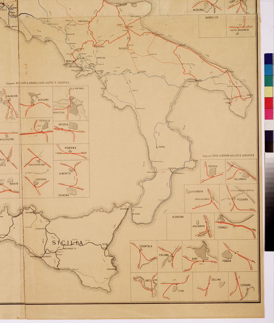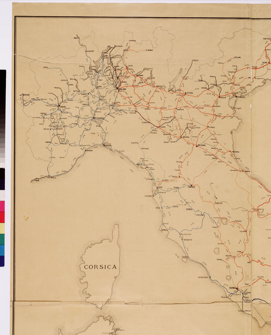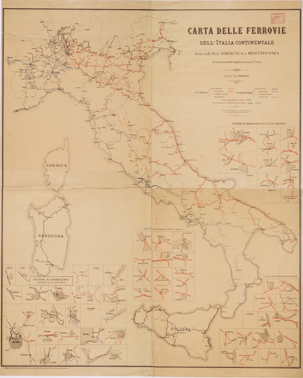 CARTA DELLE FERROVIE DELL'ITALIA CONTINENTALE DIVISA NELLE RETI ADRIATICA E MEDITERRANEA LE STRADE AUTOMOBILISTICHE E LE LINEE FERROVIARIE ITALIANE
