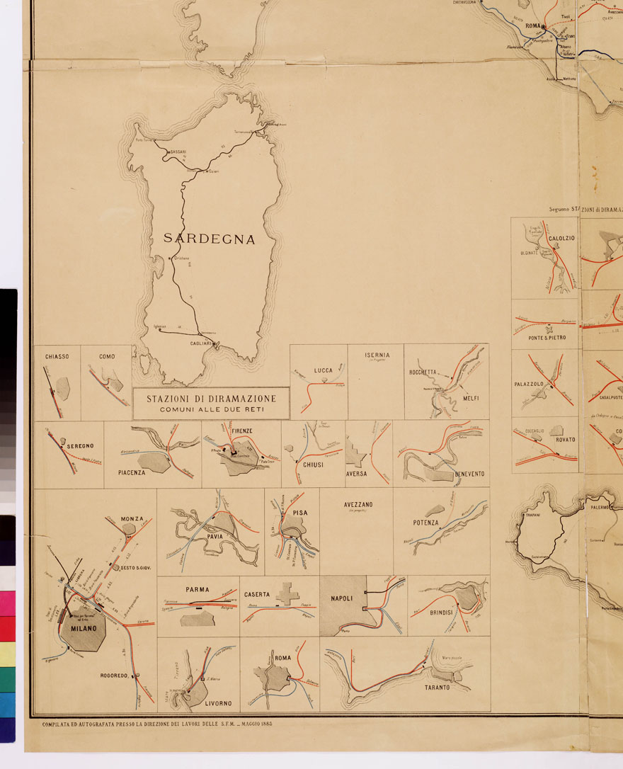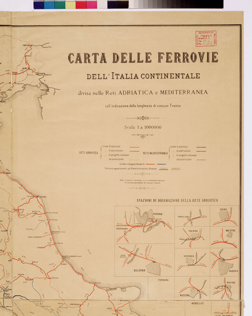 "Rappresentazione orografica planimetrica. Sotto al titolo sono presenti le spiegazioni della rete adriatica e della rete mediterranea. Nella carta sono presenti anche: le stazioni di diramazione della rete adriatica e le stazioni di diramazione comuni alle due reti. I numeri racchiusi in un circoletto indicano la massima pendenza di ciascun Tronco. Carta compilata ed autografata presso la direzione dei lavori delle S.F.M."