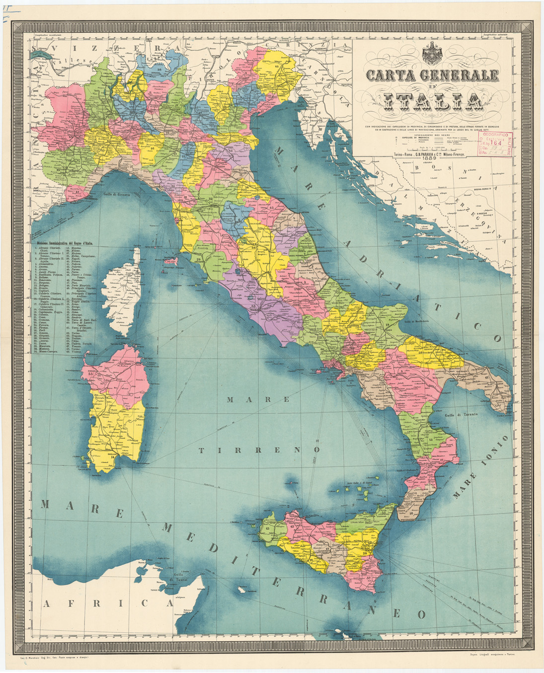 CARTA GENERALE D'ITALIA CON INDICAZIONI DEI CAPOLUOGHI DI PROVINCIA, DI CIRCONDARIO E DI PRETURA, DELLE STRADE FERRATE IN ESERCIZIO ED IN COSTRUZIONE E DELLE LINEE DI NAVIGAZIONE, ORDINATE PER LA LEGGE DEL 15 LUGLIO 1877