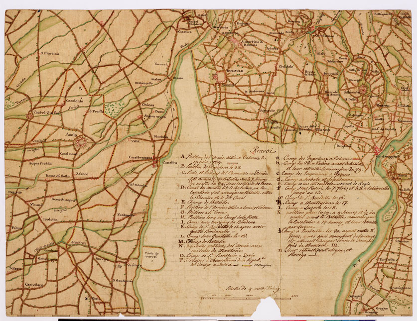 "...EN 1733 ET 34. Disegno a colori. Rappresentazione orografica a tratteggio. Grafia italiana e francese. Nel foglio n. 4 vi sono le spiegazioni delle lettere. Il documento si compone di n. 12 fogli e n. 6 tavole."