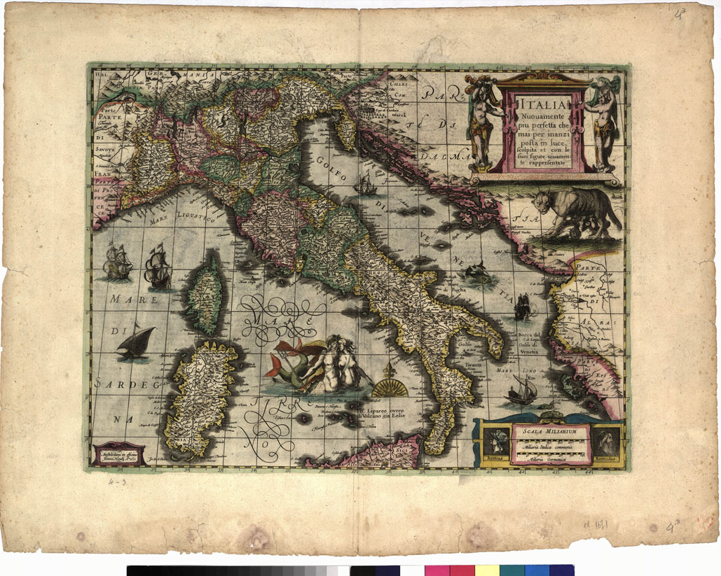 "Tavola 3. Porta stampato il n. 561. Testo spiegativo esterno in tedesco. Titolo esterno "VON ITALIA ODER WELSCHLAND IN GEMEIN". titolo interno "ITALIA NUOVAMENTE PIù PERFETTA CHE MAI...", ecc. Nell'angolo sud-ovest la scritta "AMSTELODAMI EX OFFICINA HENRICI HONDIJ ANNO 1631". Confronta anche "CARTE VARIE TRATTE DALL'ATLANTE DI GIOVANNI JANNSON" - Coll. Muller n. 2. L'intero Documento è composto dalle seguenti Tavole: Tavola 1 - "VIRO ANTIQUA DOMO GENEROSO...THEODORICO CLUVERO" Tavola 2 - "STATO DELLA CHIESA - DOMINIUM ECCLESIASTICUM IN ITALIA" Tavola 3 - "ITALIA NUOVAMENTE PIU' PERFETTA CHE MAI..." Tavola 4 - "NOVA ITALIAE DELINEATIO" Jodoco Hondio (1563-1611). Successe negli affari dell'azienda editoriale al cognato Rumoldus Mercator e venne così in possesso delle celebri tavole di Gherardo Mercatore. Fu però egli stesso un incisore valentissimo, superiore anzi come cartografo ai suoi predecessori. Fondò la serie degli Atlanti Hondius Mercator (iniziantesi con la seconda edizione del grande Mercatore) cui egli apportò il tributo delle nuove conoscenze e innovazione di metodi. Il suo monumentale lavoro venne proseguito dal figlio Enrico Hondius e dal genero Joannes Jansonius e pubblicato in altre due dozzine di edizioni in più lingue. (D1)"