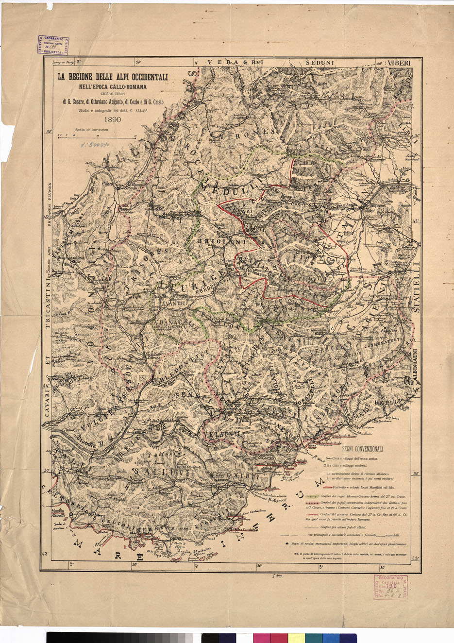 "...NELL´EPOCA GALLO-ROMANA CIOE´ AI TEMPI DI GIULIO CESARE, DI OTTAVIANO AUGUSTO, DI COZIO E DI GESU' CRISTO. STUDIO E AUTOGRAFIA DEL DOTT. G. ALLAIS, 1890. Un foglio stampato in nero e a colori. Distingue le città e i villaggi dell'epoca moderna, territorio e colonie focesi Massiliesi sul lido (rosso) i confini del regno Idonneo-Coziano prima del 27 a. C. (verde) i confini dei popoli conservatisi indipendenti dai Romani fino a G. Cesare e al 27 a. C. (rosso) i confini del governo coziano dal 27 a. C. al 66 d. C. (rosso) i confini tra alcuni popoli alpini vie principali e secondarie, constatate o desunte rovine, monumenti, luoghi celebri, ecc., dell'epoca gallo-romana."
