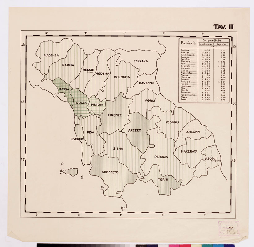 "...TAVOLE DELLE SUPERFICIE BOSCATE IN RAPPORTO ALLE TERRITORIALI. Rappresentazione orografica planimetrica. In alto a destra la tabella del rapporto tra le superfici. Milizia forestale I.G.M. (FI)."