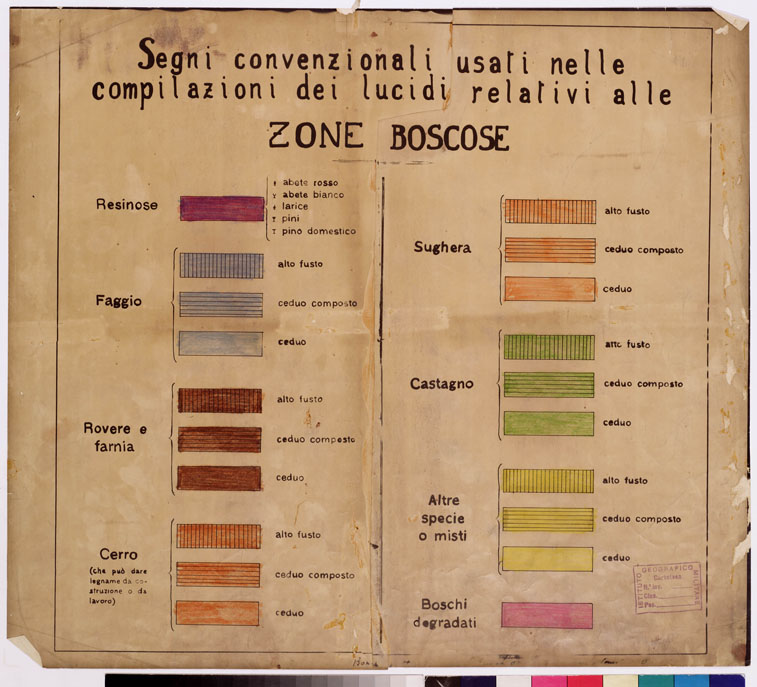 "... SEGNI CONVENZIONALI USATI NELLA COMPILAZIONE DEI LUCIDI RELATIVA ALLE ZONE BOSCOSE. Autore Milizia Forestale. Rappresentazione orografia a curve di livello. Tipologia policroma. Editore I.G.M: di Firenze Autore Milizia forestale. Rappresentazione orografica a curve di livello. Tipologia policroma.Editore I.G.M. di Firenze."