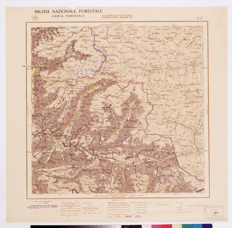 "...MILIZIA NAZIONALE FORESTALE CARTA FORESTALE Autore Milizia forestale. Rappresentazione orografica a curve di livello. Tipologia policroma. Editore I.G.M. di Firenze."