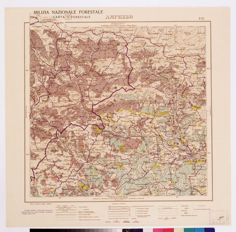 "...MILIZIA NAZIONALE FORESTALE CARTA FORESTALE Autore Milizia forestale. Rappresentazione orografica a curve di livello. Tipologia policroma. Editore I.G.M. di Firenze."