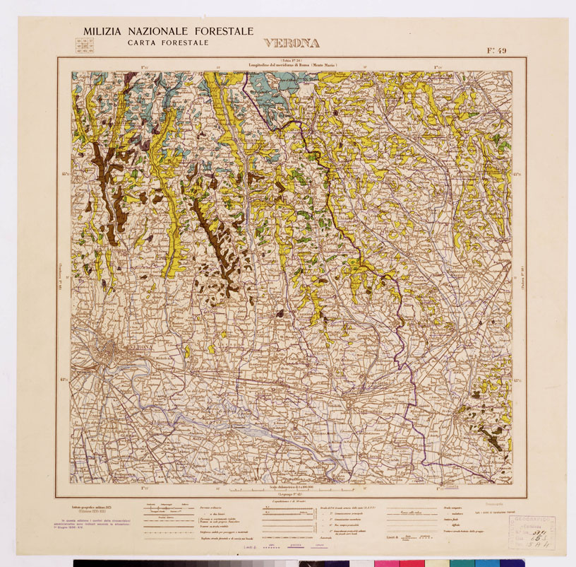 "...MILIZIA NAZIONALE FORESTALE CARTA FORESTALE Autore Milizia forestale. Rappresentazione orografica a curve di livello. Tipologia policroma. Editore I.G.M. di Firenze."