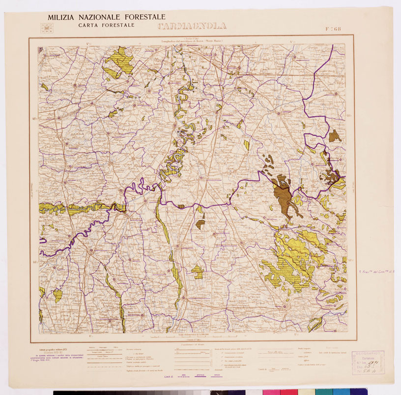 "...MILIZIA NAZIONALE FORESTALE CARTA FORESTALE Autore Milizia forestale. Rappresentazione orografica a curve di livello. Tipologia policroma. Editore I.G.M. di Firenze."
