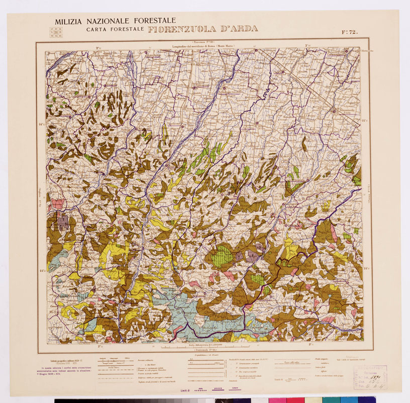 "...MILIZIA NAZIONALE FORESTALE CARTA FORESTALE Autore Milizia forestale. Rappresentazione orografica a curve di livello. Tipologia policroma. Editore I.G.M. di Firenze."