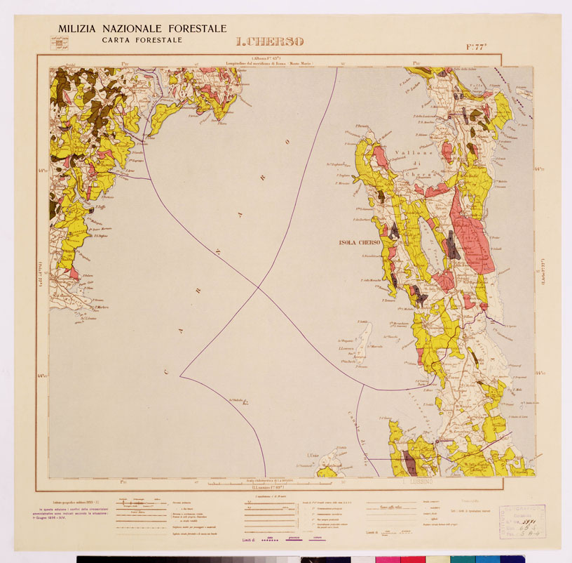 "...MILIZIA NAZIONALE FORESTALE CARTA FORESTALE Autore Milizia forestale. Rappresentazione orografica a curve di livello. Tipologia policroma. Editore I.G.M. di Firenze."