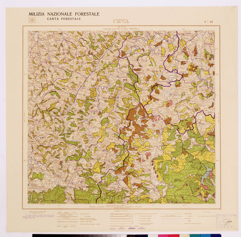 "...MILIZIA NAZIONALE FORESTALE CARTA FORESTALE Autore Milizia forestale. Rappresentazione orografica a curve di livello. Tipologia policroma. Editore I.G.M. di Firenze."