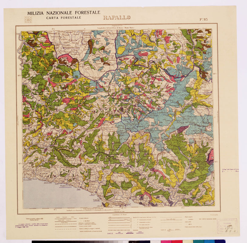 "...MILIZIA NAZIONALE FORESTALE CARTA FORESTALE Autore Milizia forestale. Rappresentazione orografica a curve di livello. Tipologia policroma. Editore I.G.M. di Firenze."