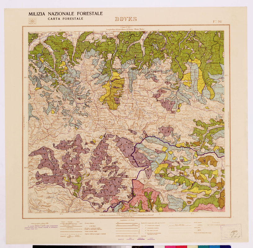 "...MILIZIA NAZIONALE FORESTALE CARTA FORESTALE Autore Milizia forestale. Rappresentazione orografica a curve di livello. Tipologia policroma. Editore I.G.M. di Firenze."