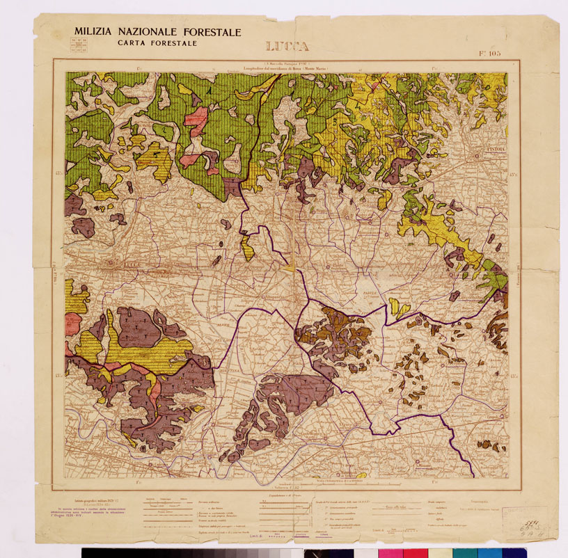 "...MILIZIA NAZIONALE FORESTALE CARTA FORESTALE Autore Milizia forestale. Rappresentazione orografica a curve di livello. Tipologia policroma. Editore I.G.M. di Firenze."