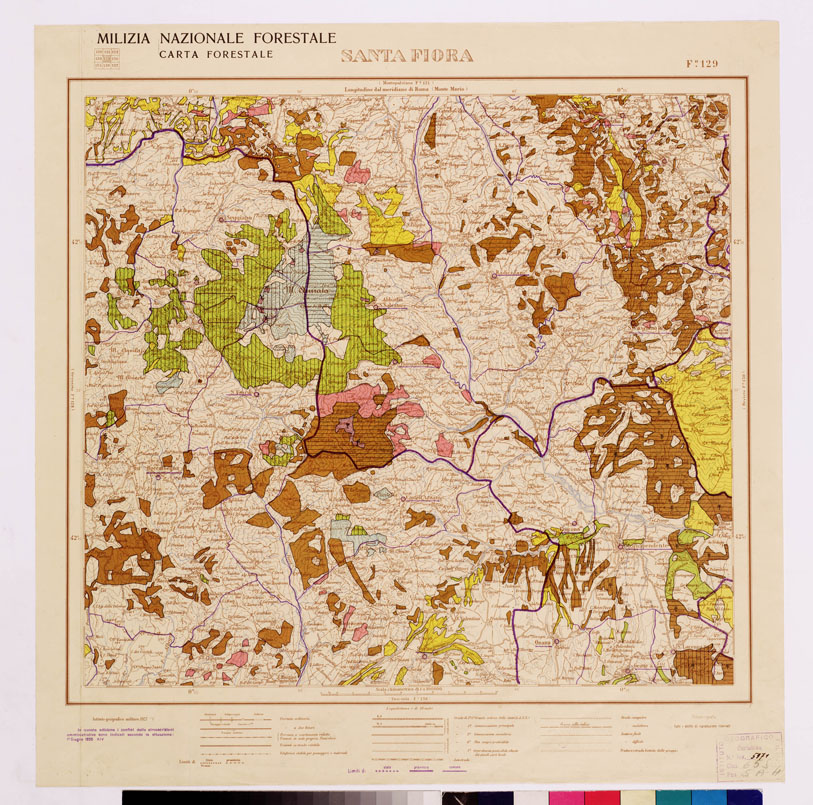 "...MILIZIA NAZIONALE FORESTALE CARTA FORESTALE Autore Milizia forestale. Rappresentazione orografica a curve di livello. Tipologia policroma. Editore I.G.M. di Firenze."