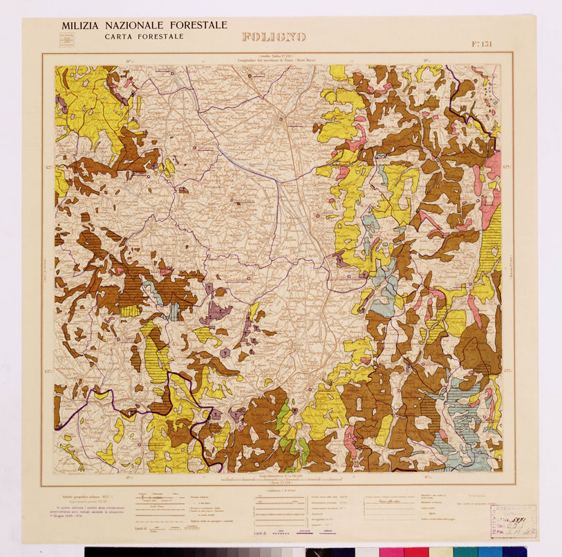 "...MILIZIA NAZIONALE FORESTALE CARTA FORESTALE Autore Milizia forestale. Rappresentazione orografica a curve di livello. Tipologia policroma. Editore I.G.M. di Firenze."