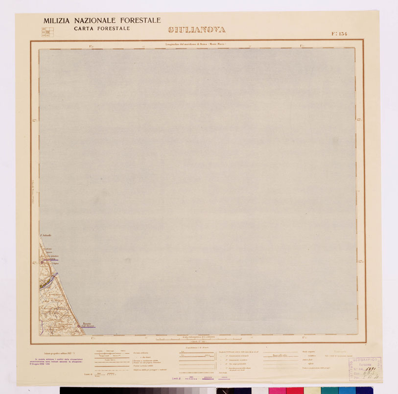 "...MILIZIA NAZIONALE FORESTALE CARTA FORESTALE Autore Milizia forestale. Rappresentazione orografica a curve di livello. Tipologia policroma. Editore I.G.M. di Firenze."