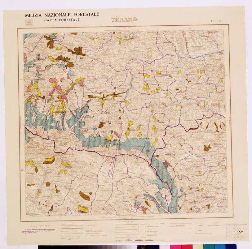 "...MILIZIA NAZIONALE FORESTALE CARTA FORESTALE Autore Milizia forestale. Rappresentazione orografica a curve di livello. Tipologia policroma. Editore I.G.M. di Firenze."