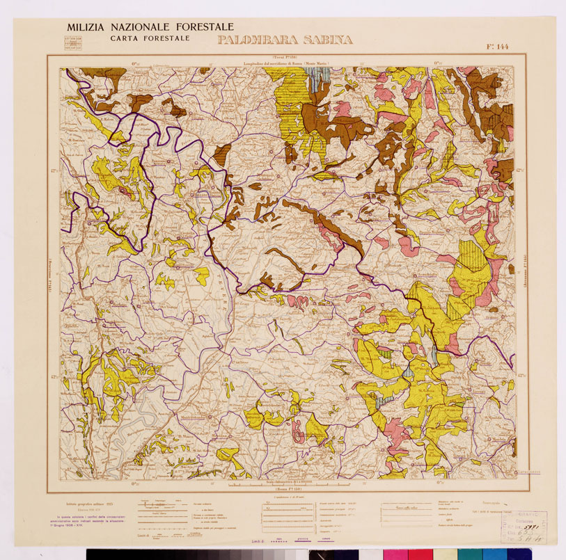 "...MILIZIA NAZIONALE FORESTALE CARTA FORESTALE Autore Milizia forestale. Rappresentazione orografica a curve di livello. Tipologia policroma. Editore I.G.M. di Firenze."