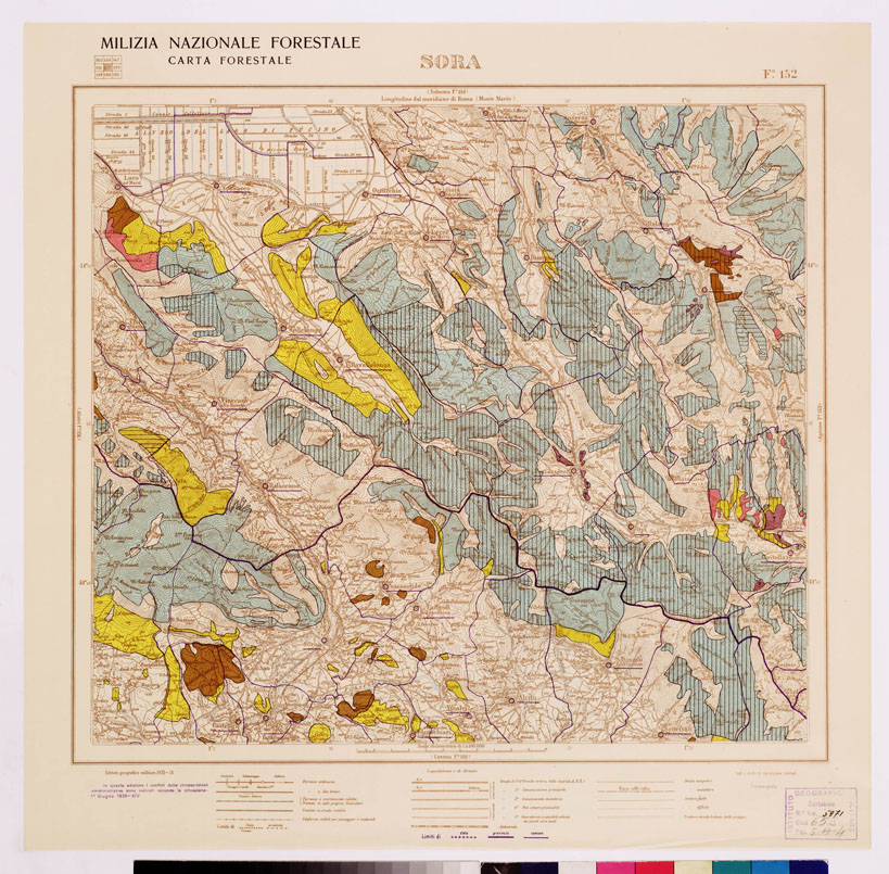 "...MILIZIA NAZIONALE FORESTALE CARTA FORESTALE Autore Milizia forestale. Rappresentazione orografica a curve di livello. Tipologia policroma. Editore I.G.M. di Firenze."