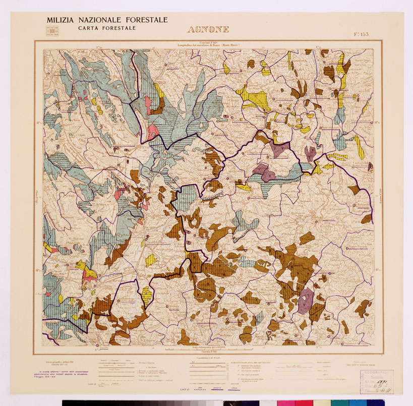 "...MILIZIA NAZIONALE FORESTALE CARTA FORESTALE Autore Milizia forestale. Rappresentazione orografica a curve di livello. Tipologia policroma. Editore I.G.M. di Firenze."