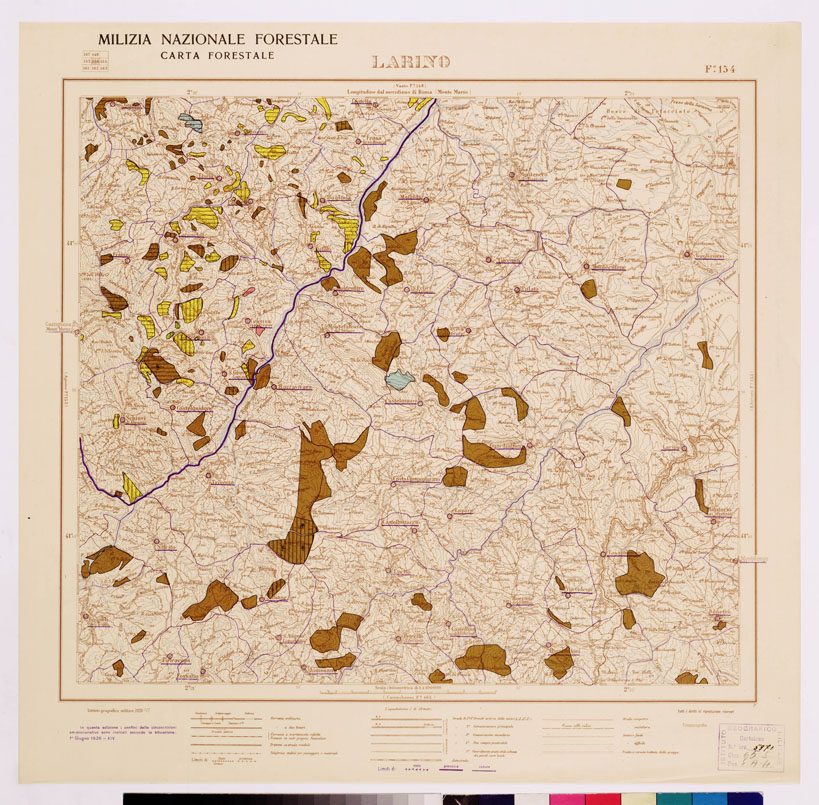 "...MILIZIA NAZIONALE FORESTALE CARTA FORESTALE Autore Milizia forestale. Rappresentazione orografica a curve di livello. Tipologia policroma. Editore I.G.M. di Firenze."