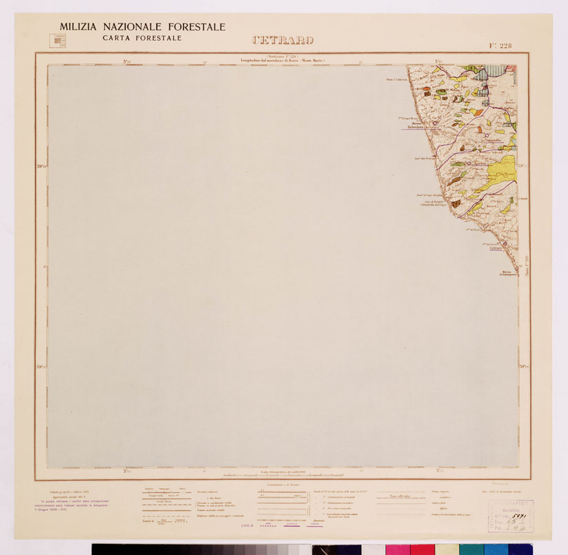 "...MILIZIA NAZIONALE FORESTALE CARTA FORESTALE Autore Milizia forestale. Rappresentazione orografica a curve di livello. Tipologia policroma. Editore I.G.M. di Firenze."