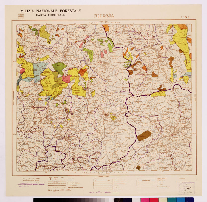 "...MILIZIA NAZIONALE FORESTALE CARTA FORESTALE Autore Milizia forestale. Rappresentazione orografica a curve di livello. Tipologia policroma. Editore I.G.M. di Firenze."