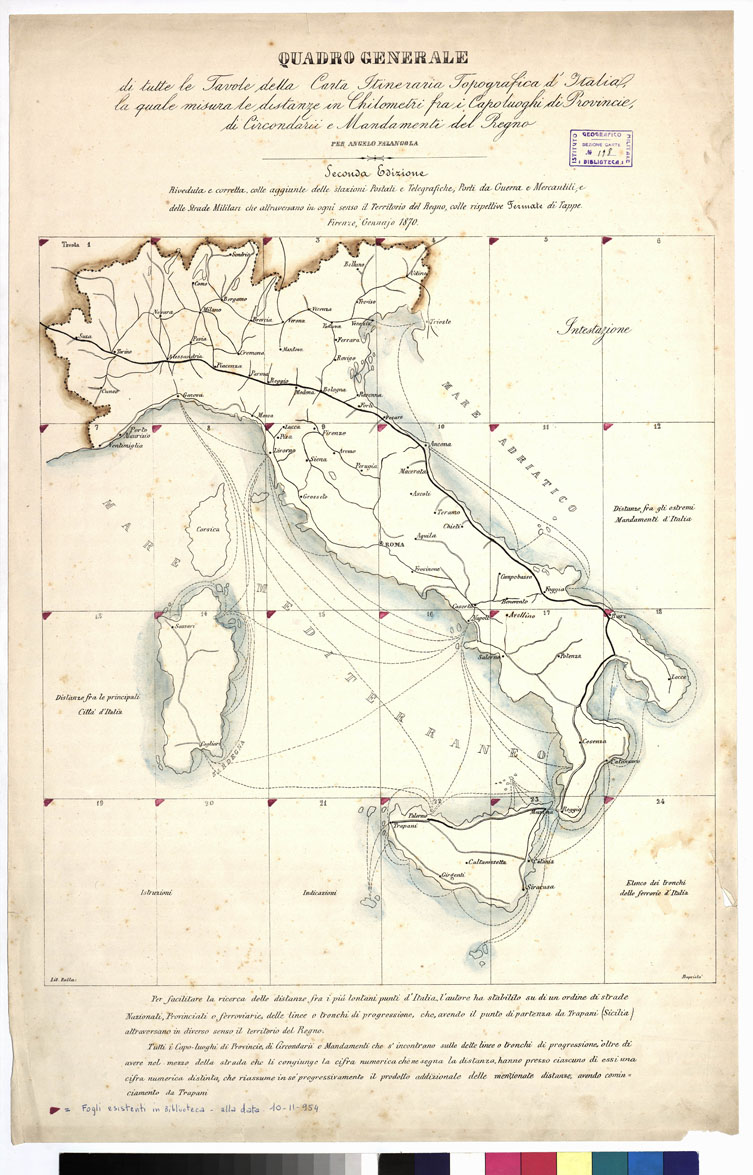 "..PER LE DISTANZE IN CHILOMETRI FRA CAPOLUOGHI DI PROVINCIA DI CIRCONDARIO E DI MANDAMENTO DEL REGNO D´ITALIA PER ANGELO FALANGOLA DELEGATO DI P. S. Rappresentazione orografica planimetrica. Grafia italiana. Luogo di edizione Firenze, Calcolitografia Rolla."