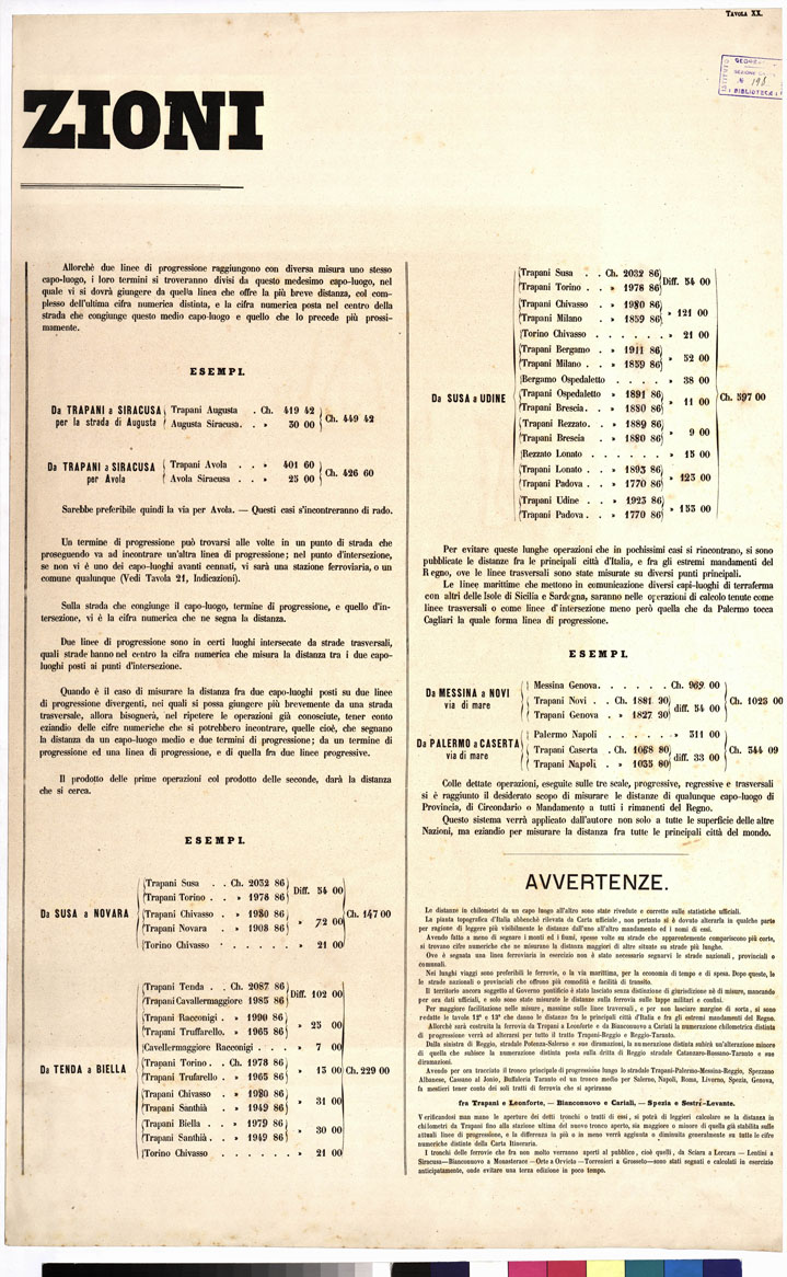 "..PER LE DISTANZE IN CHILOMETRI FRA CAPOLUOGHI DI PROVINCIA DI CIRCONDARIO E DI MANDAMENTO DEL REGNO D´ITALIA PER ANGELO FALANGOLA DELEGATO DI P. S. Rappresentazione orografica planimetrica. Grafia italiana. Luogo di edizione Firenze, Calcolitografia Rolla."