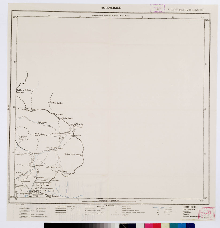 Il governo del Regno, considerando inadeguati i disomogenei lavori preunitari affidò nel 1872 all´Istituto Topografico Militare (il quale assunse l´attuale denominazione nel 1882) l´esecuzione del progetto di rilevamento generale del territorio dello Stato e della formazione della nuova Carta Topografica d´Italia alla scala 1:100000. L´Istituto, formatosi dalla fusione dell´Ufficio Tecnico del Corpo di Stato Maggiore del Regno Sardo con gli Istituti e gli Uffici topografici e cartografici dei diversi stati esistenti nella penisola prima che si compisse la sua unità politica, ereditò il materiale scientifico e cartografico preunitario caratterizzandosi di fatto come il depositario e continuatore della scuola e della tradizione cartografica nazionale.