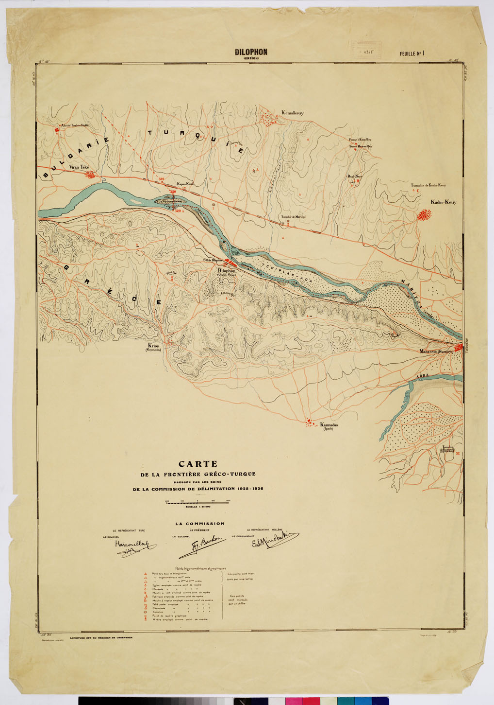CARTE DE LA FRONTIERE GRECO-TURQUE DRESSE PAR LES SOIN DE LA COMMISSION DE DELIMITATION - FEUILLE N. 1 DILOPHON