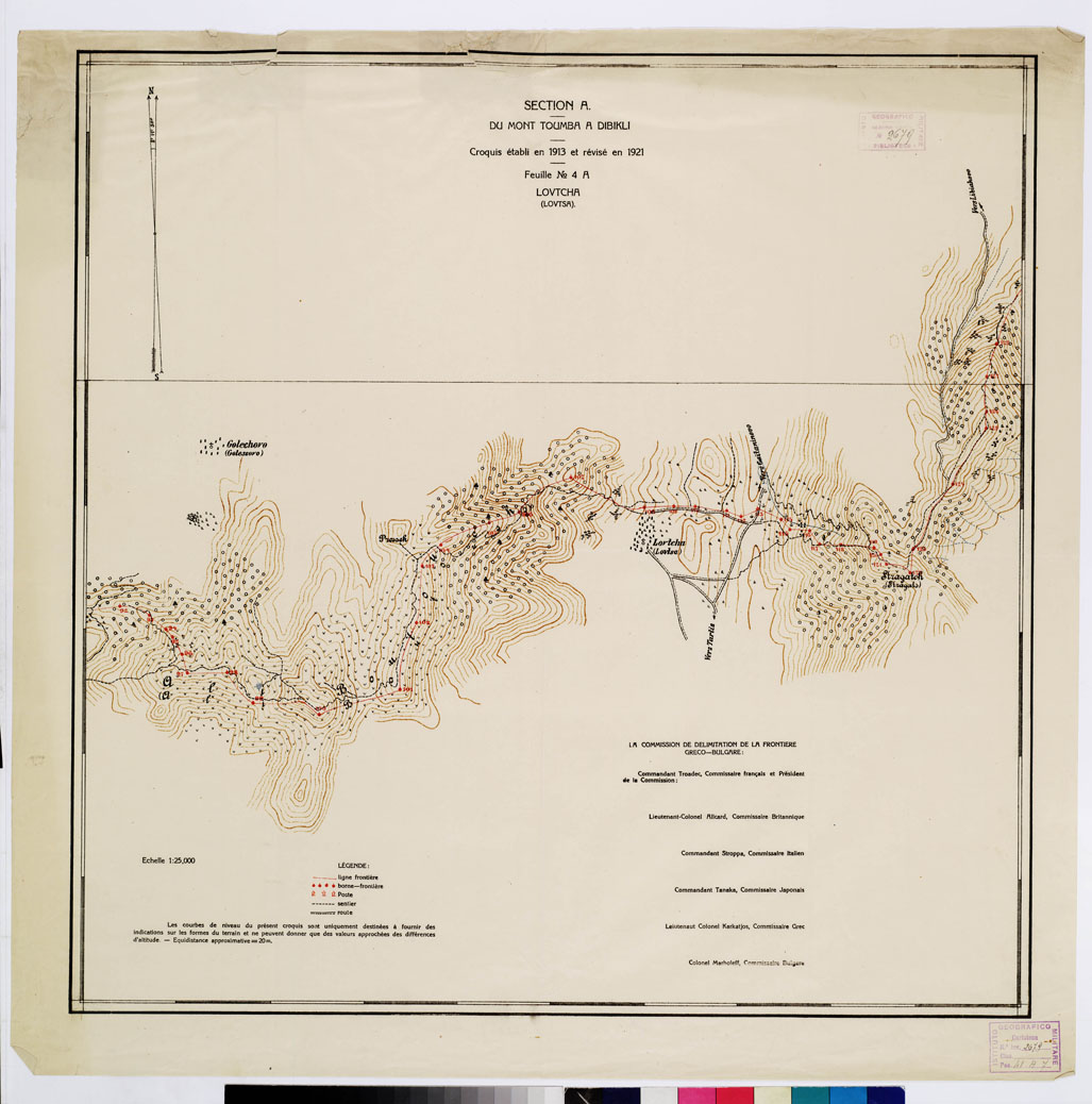 "Autore Commissione Confini. Rappresentazione orografica a curve di livello. Editore Imprimerie D' Etat - Luogo di edizione Sofia. Grafia francese locale. Tipologia policroma."