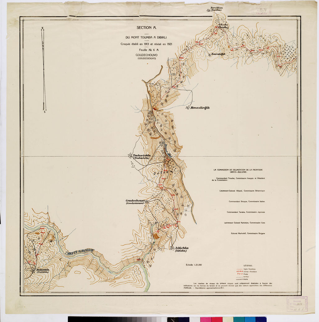 "Autore Commissione Confini. Rappresentazione orografica a curve di livello. Editore Imprimerie D' Etat - Luogo di edizione Sofia. Grafia francese locale. Tipologia policroma."