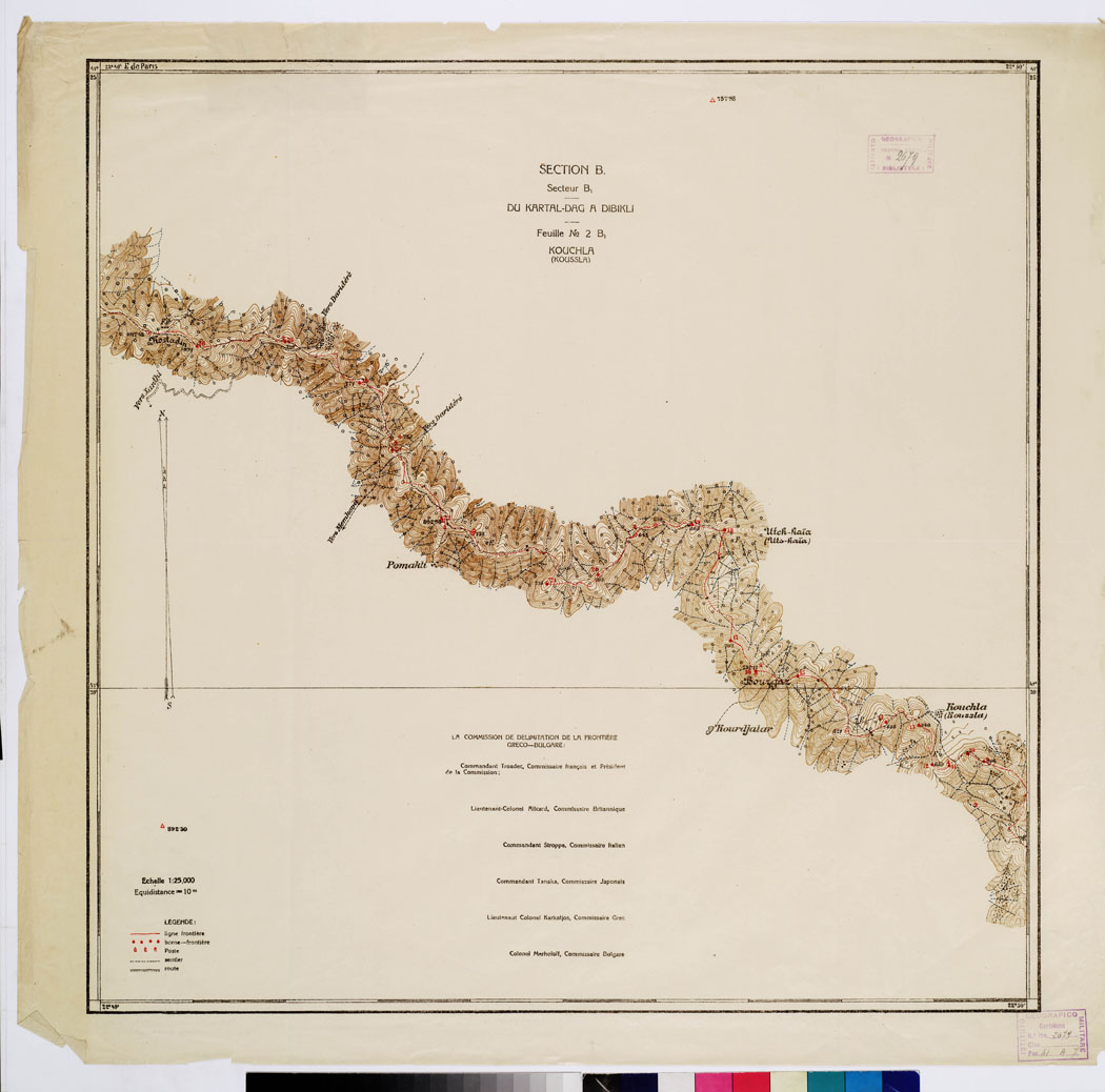"Autore Commissione Confini. Rappresentazione orografica a curve di livello. Editore Imprimerie D' Etat - Luogo di edizione Sofia. Grafia francese locale. Tipologia policroma."