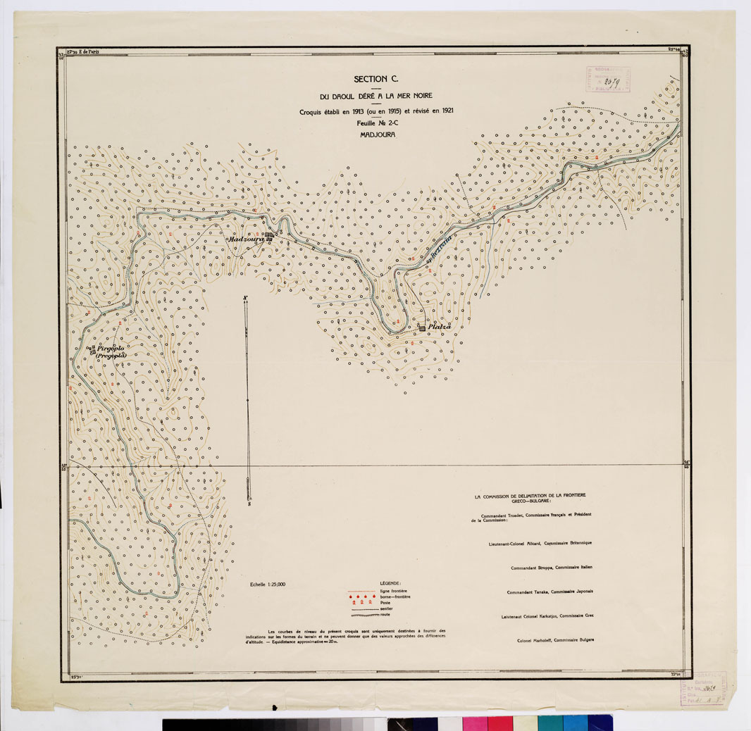 "Autore Commissione Confini. Rappresentazione orografica a curve di livello. Editore Imprimerie D' Etat - Luogo di edizione Sofia. Grafia francese locale. Tipologia policroma."