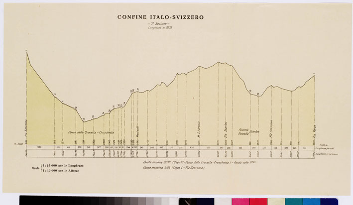 " Autore Commissione Revisione Confine Italo-Svizzero. Rappresentazione orografica a curve di livello.Tipologia policroma"