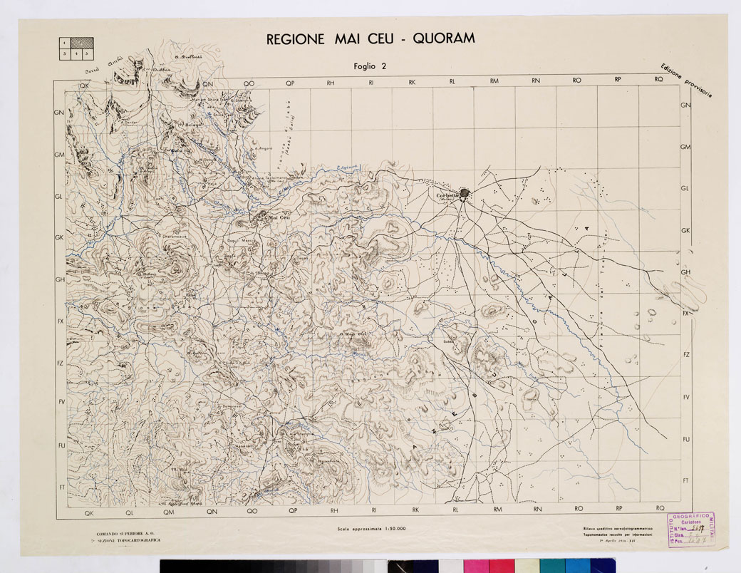 "Autore Comando Superiore A.O.. - Settima sezione Topocartografica. Rilievo speditivo aereofotogrammetrico. La toponomastica è stata raccolta attraverso informazioni."