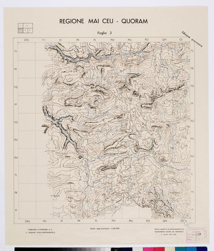 "Autore Comando Superiore A.O.. - Settima sezione Topocartografica. Rilievo speditivo aereofotogrammetrico. La toponomastica è stata raccolta attraverso informazioni."