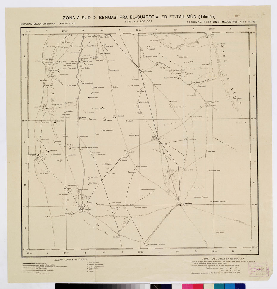 "Governo della Cirenaica. Ufficio Studi. Un foglio stampato in nero poggiato su rilievi regolari dell'I.G.M. e rilievi speditivi dell'Ufficio Studi. Distingue ferrovie ordinarie, strade rotabili a fondo artificiale, carreggiabili a fondo naturale con parziali adattamenti, piste automobilistiche, comuniczioni non carreggiabili, sentieri, rovine di castelli antichi, tombe mussulmane, marabutti con e senza fabbricato,zauie o moschee, pozzi e cisterne. A sinistra in basso è data la leggenda dei segni convenzionali. A destra trovasi l'indicazione delle fonti utilizzate per la compilazione del foglio. Disegno di G. Ferrero."
